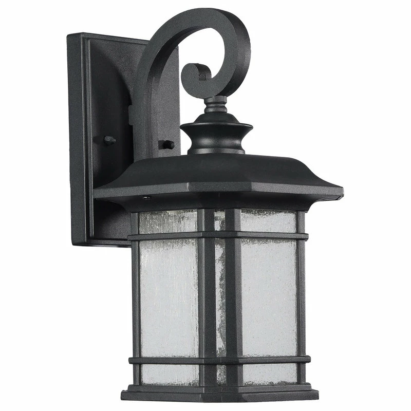 This transitional LED outdoor wall lantern features a textured black finish that will complement many traditional or transitional decors. The clear seedy glass panels add interest and create a warm welcoming glow to the outside of your home. The light output of the 6 watt LED bulb is equivalent to a 60 watt incandescent bulb and will last as much as 10 times longer.