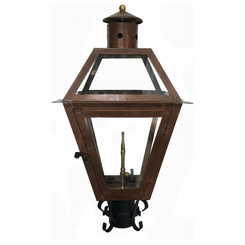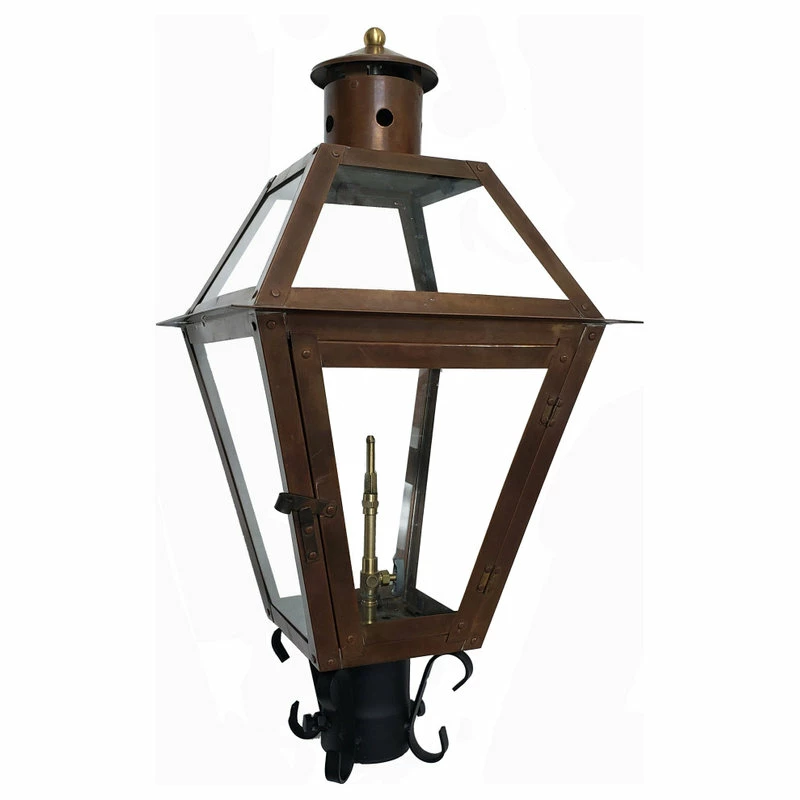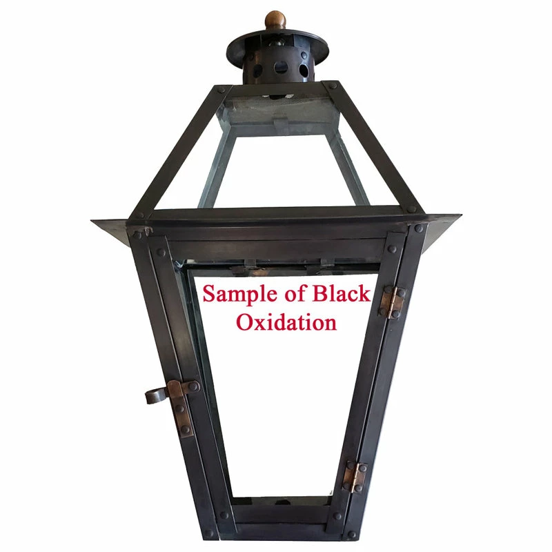 Traditional French Quarter Gas or Electric Lantern Available in 15″, 18″, 21″, 24″, 28″, 35″, and 44″. Available in Natural gas or Propane(LP). Comes in our Brown Oxidation and is also available in Bronze(Black), Green Verdigris, and Powder Coated Black. New Orleans French Quarter Style Gas Lighting