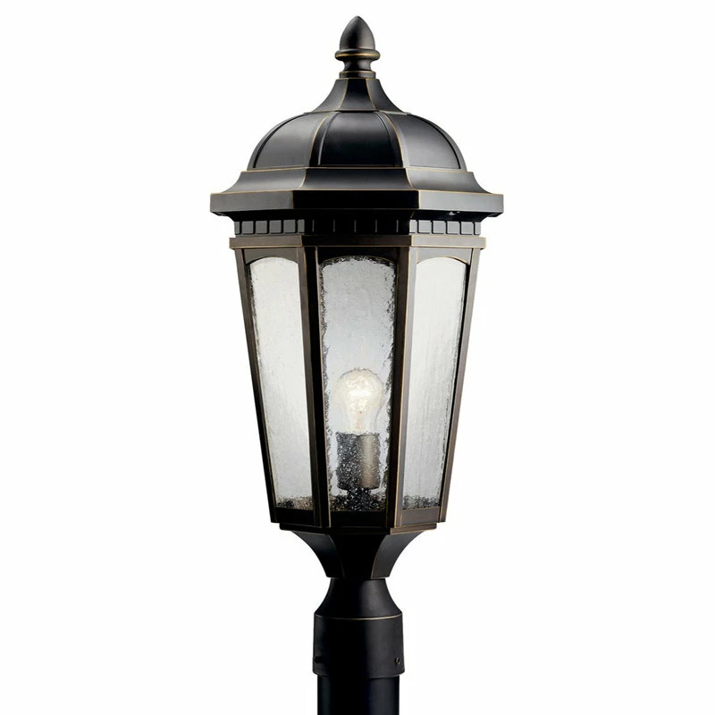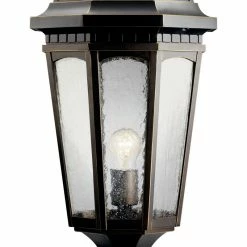 Uncluttered and traditional, this attractive 1 light post top fixture from the Courtyard(TM) collection adds the warmth of a secluded terrace to any patio or porch. What a welcoming beacon for your home’s exterior. Done in a Rubbed Bronze finish with Clear-seedy glass. Post not included.