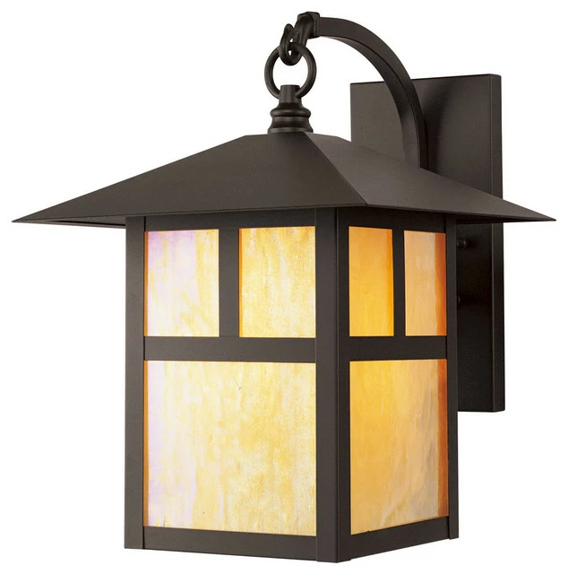 Bright, iridescent tiffany glass and bold lines put a fresh spin on a classic look in this beautiful Montclair Mission style outdoor wall lantern. Made from solid brass and finished in bronze, the top hanging lantern is attached to the backplate by a graceful, curved arm. T-bar overlay linear details on the frame give it an architectural window-inspired look.
