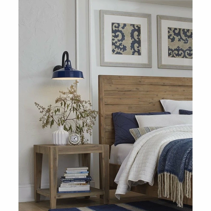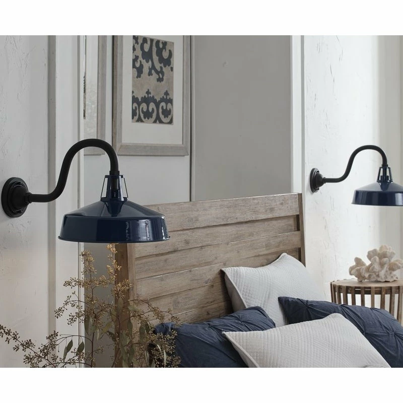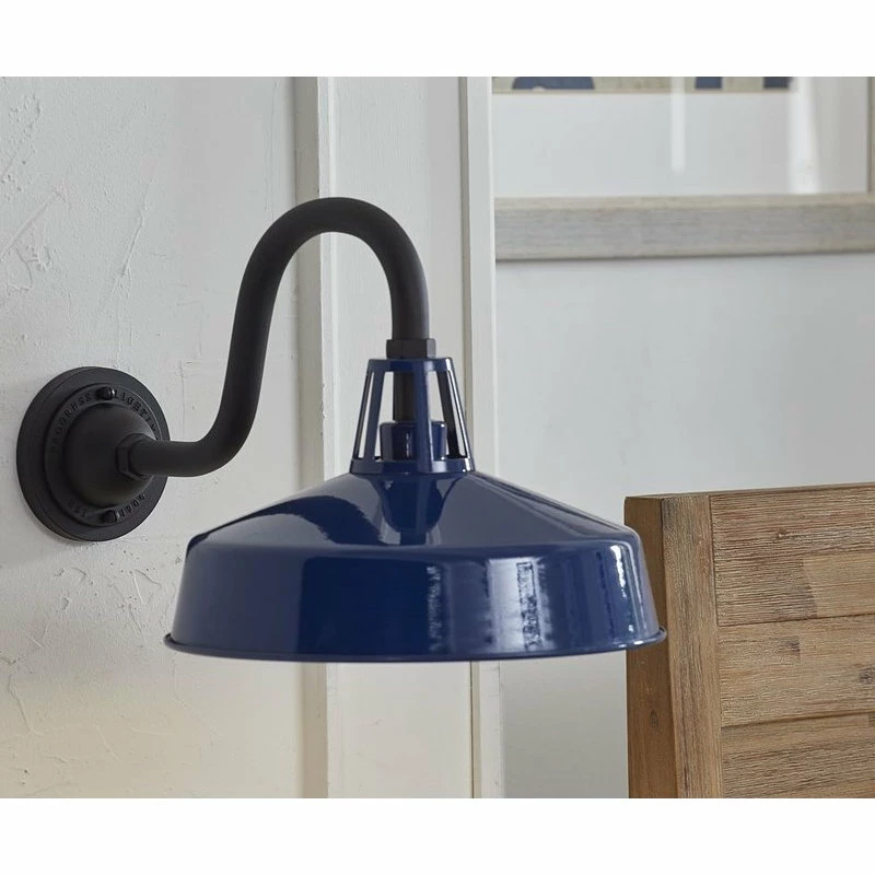 A fun take on the traditional warehouse shade, Cedar Springs can be a stylish addition to any indoor or outdoor space. Offered in a generous size and featuring a black gooseneck arm style and navy shade, this classic Farmhouse fixture serves as an eye-catching addition to a variety of facades.