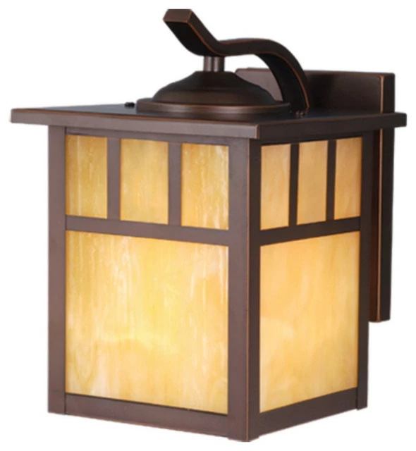 Flat strips of burnished bronze outline honey opal glass panes in the Mission collection. The simple design of this fixture has a mission style look perfect for Frank Lloyd Wright prairie inspired decors. This outdoor wall light is ideal for your porch, entryway, garage, or any other area of your home.