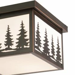 Evoking the spirit of the wilderness, this rustic themed light is clad in a burnished bronze finish and features silhouetted tree imagery atop glowing white tiffany style glass. It is a great choice for a vacation lodge, cabin or suburban home and will complement a variety of home styles: anywhere you want to bring an element of nature. This outdoor ceiling light is ideal for your porch, entryway, or any other area of your home.